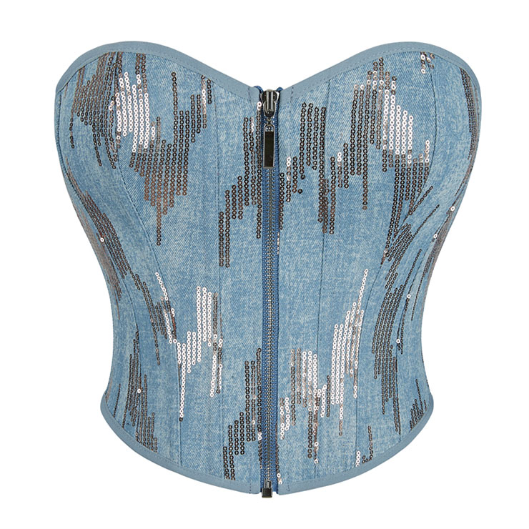 This blue zippered tube top with silver sequins has a waist tie at the back and can be paired with a variety of skirts and pants.