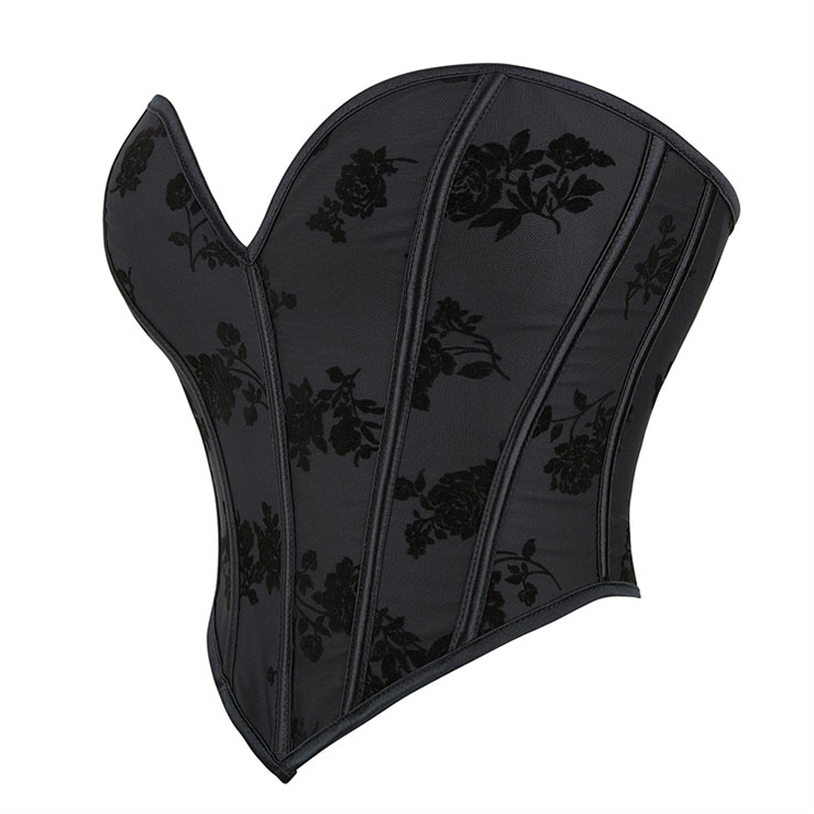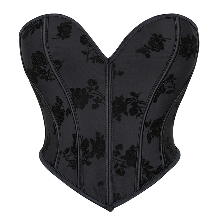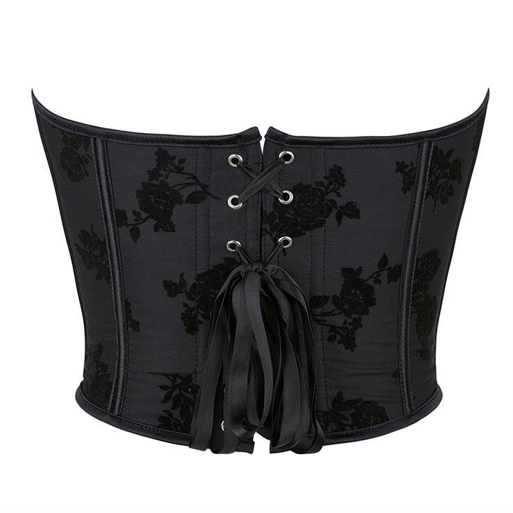 Features of this retro black tube top bra: Made of black flocking fabric, exquisitely printed patterns, 13 pieces of plastic bonding for shaping, and rear laces to tighten.