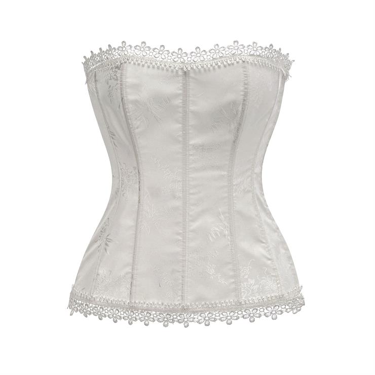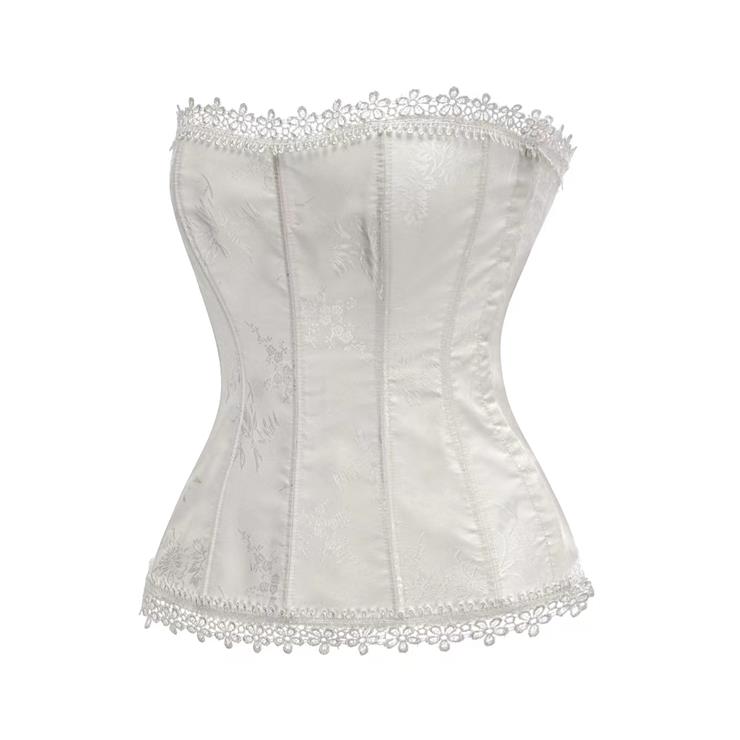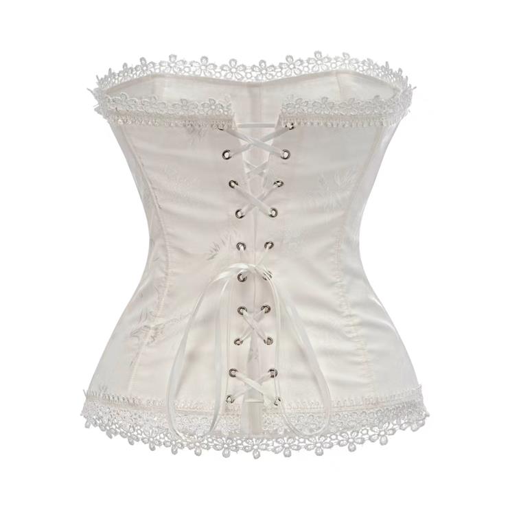 This white body shaper has small flower edging on the top and bottom, which is very delicate and beautiful. It has a tie closure at the back for easy wearing.